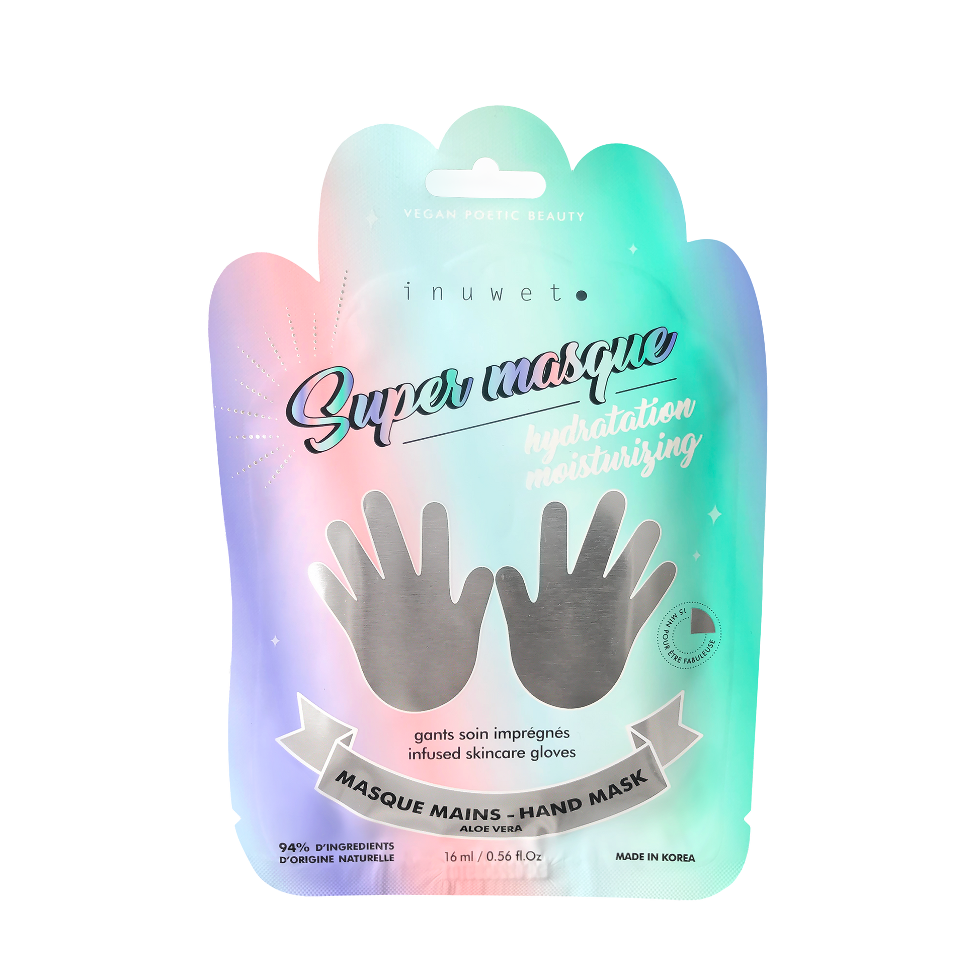 Et un masque mains hydratant en forme de gants imprégnés, adapté aux besoins spécifiques de la peau grâce à un cocktail d’extraits d’aloe vera, noix de coco, mangue et amande douce, aux vertus nourrissantes.